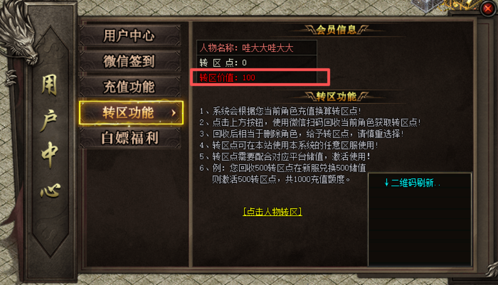 2、若转区价值有数量即可点击人物转区生成转区二维码,打开微信扫一扫操作